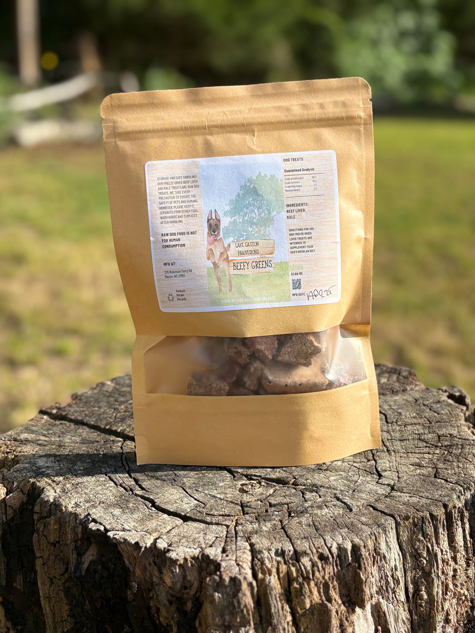 Lake Gaston Pawvisions Beefy Greens– a premium pet treat that combines the rich, savory taste of 100% beef liver with the added nutritional benefits of fresh kale grown on our farm in Warren County, NC. This unique blend offers a delightful flavor that your furry companion will love while providing essential nutrients for optimal health.